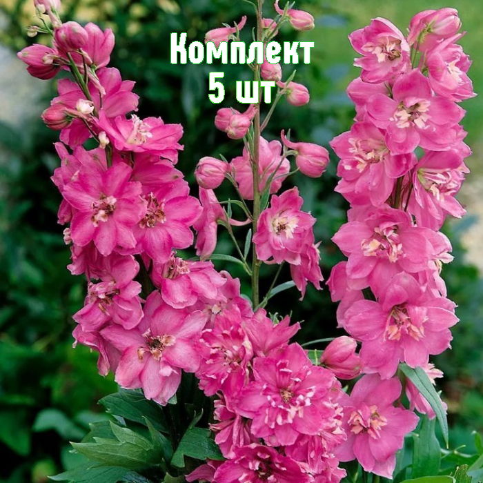 Дельфиниум Пасифик Астолат — комплект саженцев 5 шт., который преобразит вашу цветочную композицию. Высокорослый многолетник с прямыми стеблями до 150 см и эффектными метельчатыми соцветиями до 70 см. Махровые крупные цветки (≈6 см) лилово-розового тона с контрастным тёмным центром создают выразительные «свечи» на грядке. Растение морозостойкое, надёжно зимует и каждый сезон радует пышным цветением. Внимание: все части растения ядовиты — соблюдайте меры безопасности при посадке и уходе.